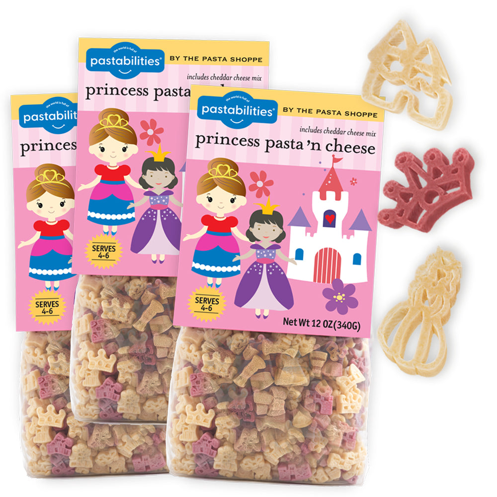 - Includes 6 bags total: 3 bags of Princess Pasta (14 oz.), and 3 packages of Dinosaur Pasta ‘n Cheese (12 oz. each)
